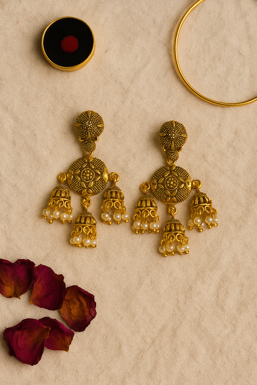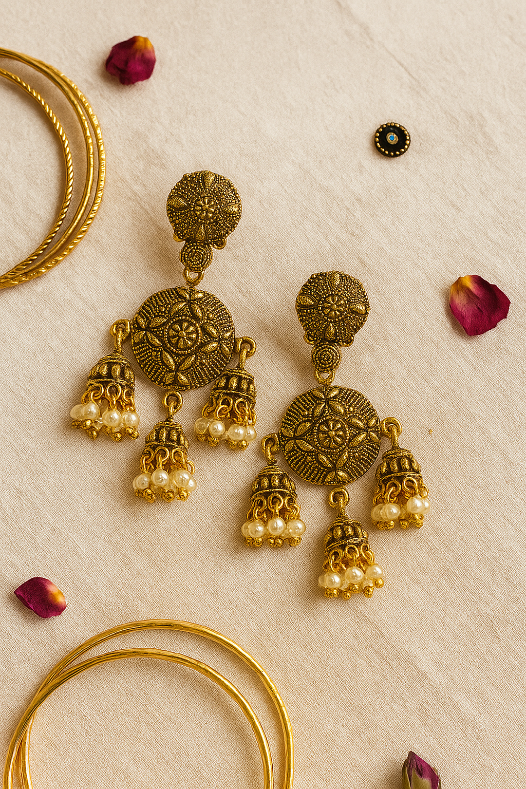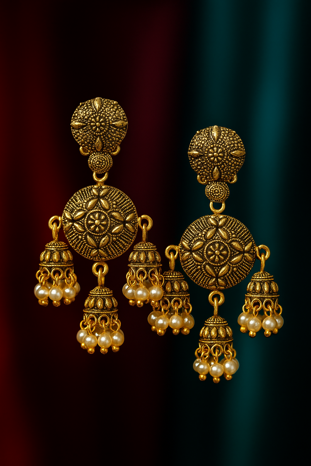 Each earring features a circular engraved motif adorned with delicately hanging jhumka bells, finished with elegant pearl drops that enhance their royal appeal. The antique gold finish gives them a rich, heritage-inspired look, making them perfect for festive occasions, weddings, and cultural celebrations.