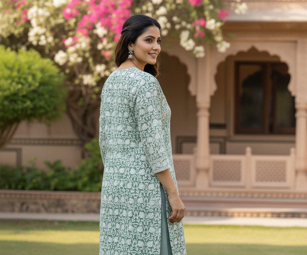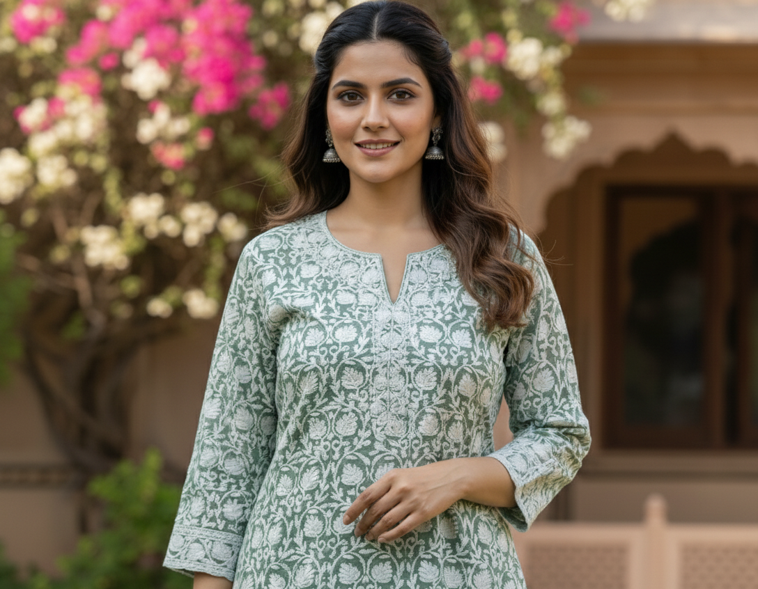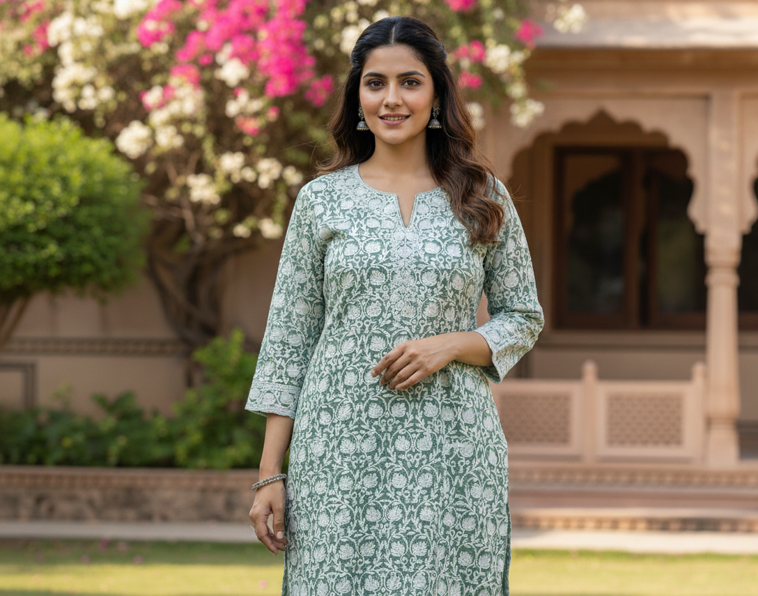 Refresh your ethnic wardrobe with this beautifully designed sage green printed kurti, crafted to offer a perfect balance of comfort and sophistication. Featuring intricate traditional floral motifs throughout, this kurti reflects timeless craftsmanship while maintaining a modern, elegant appeal.