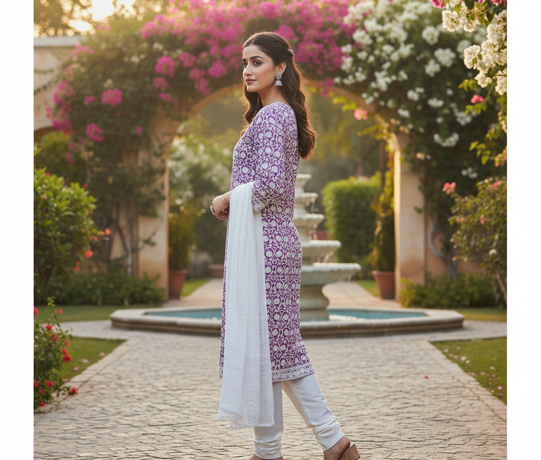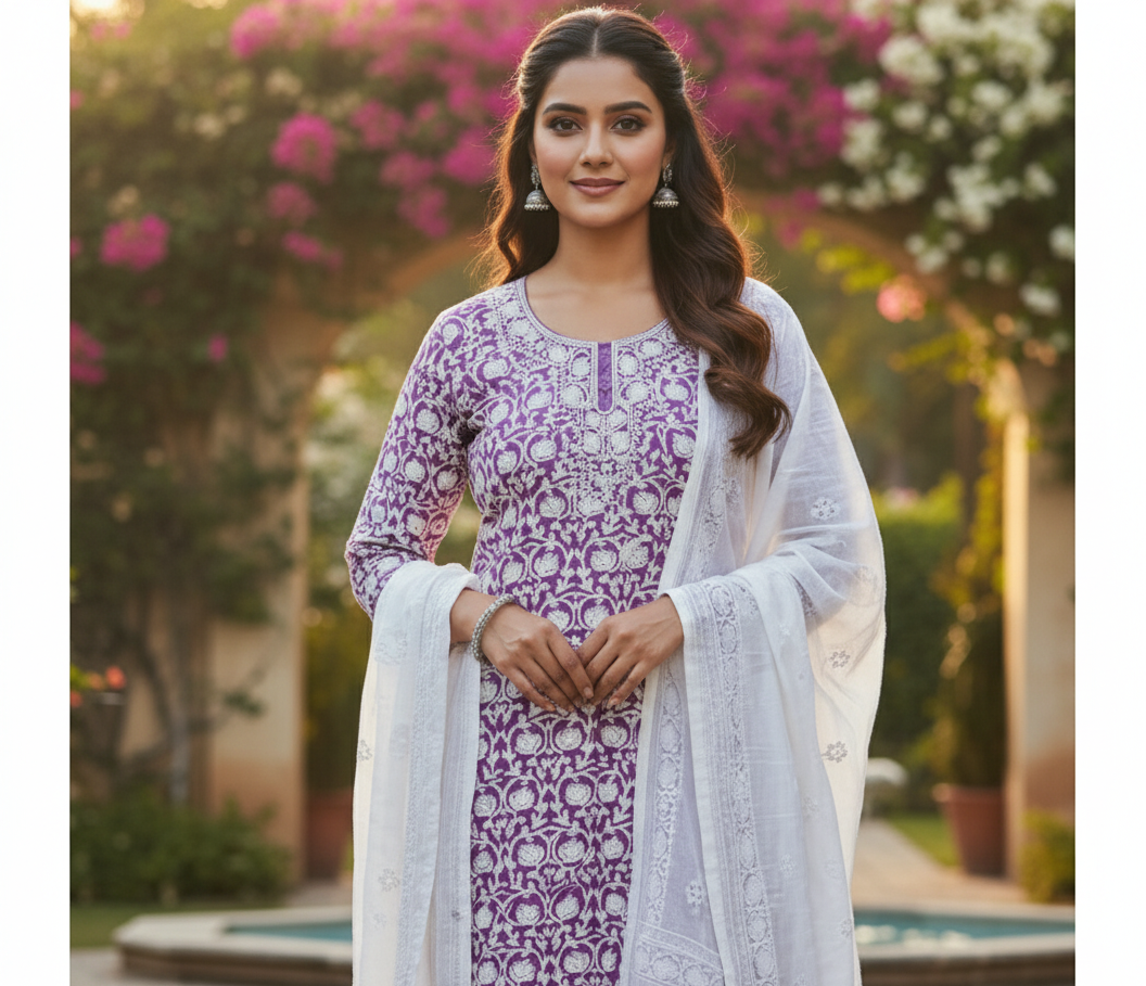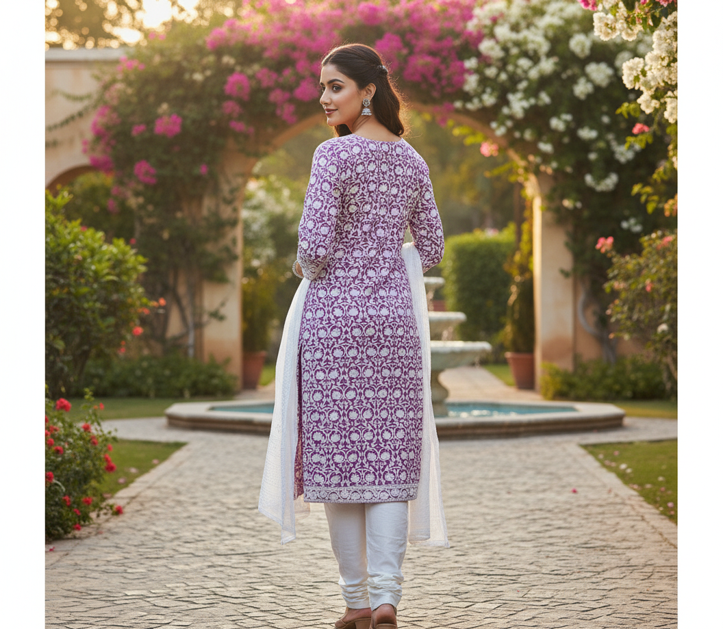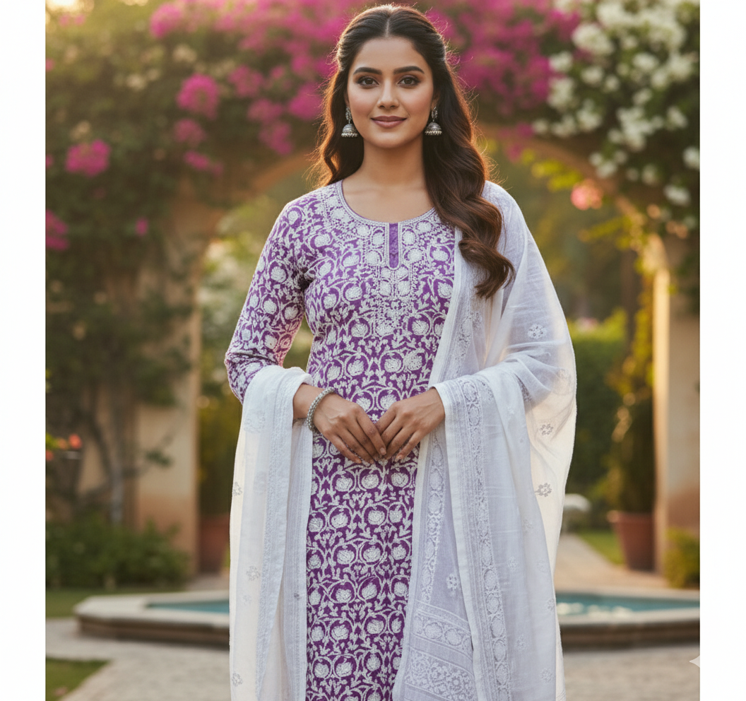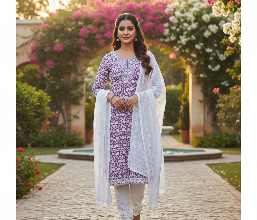 Elevate your ethnic wardrobe with this stunning royal lavender embroidered suit, designed to reflect timeless grace and modern sophistication. Crafted with intricate white floral embroidery across the kurta, this ensemble brings together traditional artistry and contemporary elegance. The soothing lavender base paired with a delicate white dupatta creates a soft, feminine look perfect for festive gatherings, casual celebrations, and special occasions.